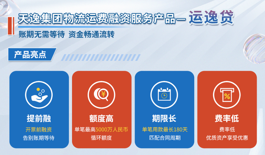 天逸集團(tuán)“運(yùn)逸貸”產(chǎn)品,專為物流企業(yè)定制,助力企業(yè)降本增效。首先,運(yùn)逸貸支持“提前融”,讓物流企業(yè)無需再等待賬期,資金能夠迅速到位,有效緩解資金壓力。其次,運(yùn)逸貸的額度高,單筆最高可達(dá)5000萬元人民幣,且為循環(huán)額度,物流企業(yè)可以根據(jù)自身業(yè)務(wù)需求靈活使用,無需頻繁申請(qǐng)。此外,運(yùn)逸貸的用款期限長,單筆用款最長可達(dá)180天,能夠精準(zhǔn)匹配物流合同周期,確保資金的穩(wěn)定供應(yīng)。最后,運(yùn)逸貸的費(fèi)率低,優(yōu)質(zhì)資產(chǎn)還能享受更多優(yōu)惠,大大降低了物流企業(yè)的融資成本。